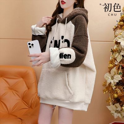 初色 拼接字母羊羔絨寬鬆長袖連帽上衣女上衣-共2色-39905(M-XL可選)