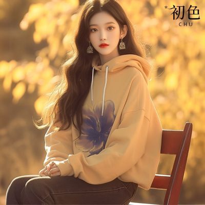 初色 寬鬆連帽抽繩花朵印花長袖連帽T恤上衣女上衣-黃色-38162(M-3XL可選)