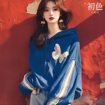 初色 抽繩連帽蝴蝶印花拼接條紋長袖T恤帽T上衣女上衣-藍色-38113(M-3XL可選)
