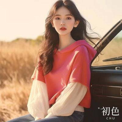 初色 撞色假兩件休閒連帽抽繩長袖上衣女上衣-共2色-39866(L-4XL可選)