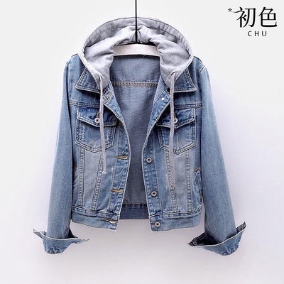初色 休閒百搭抽繩連帽坎肩長袖牛仔夾克外套-共2色-32137(M-2XL可選)$56476折