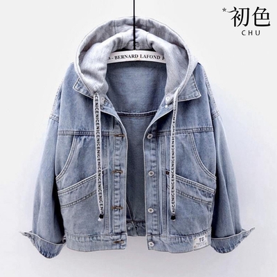 初色 休閒短款拼接連帽翻領大口袋牛仔夾克外套-淺藍色-30938(M-2XL可選)$58776折