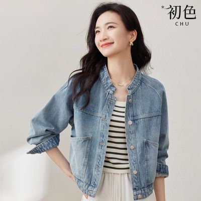 初色 復古休閒簡約大口袋水洗立領長袖牛仔外套女外套-藍色-36858(M-XL可選)$64776折