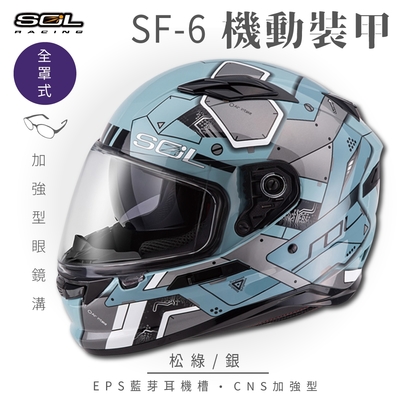 【SOL】SF-6 機動裝甲 松綠/銀 全罩(安全帽│機車│內襯│鏡片│全罩式│藍芽耳機槽│內墨鏡片│GOGORO)$3,381$3,841