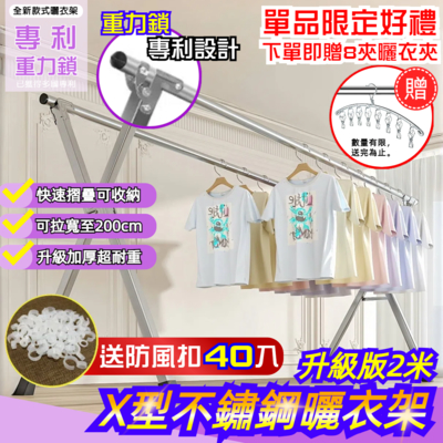 STYLE 格調 重力鎖-贈送40入防風扣★專利重力鎖2米X型不鏽鋼伸縮晾曬衣架(5秒收合/曬棉被最給力)