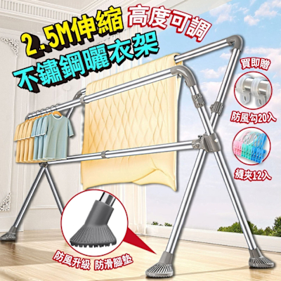 STYLE 格調 贈防風扣/彩色襪夾 升級加厚防滑腳墊高度可升降2.5米X型三桿不鏽鋼折疊伸縮曬衣架