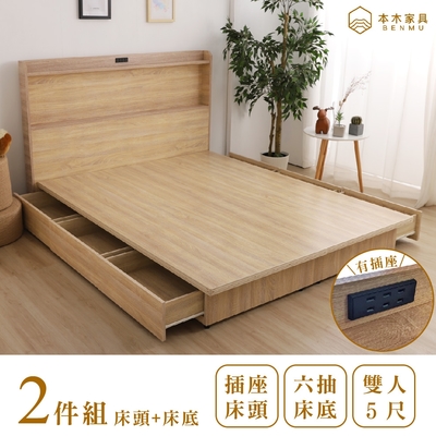 本木家具-羅格 日式插座房間二件組-雙人5尺 床頭+六抽床底