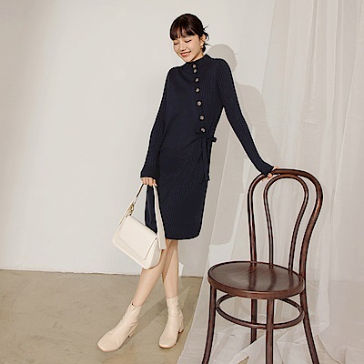 彈力針織高領不對稱剪裁排釦綁帶洋裝-OB嚴選