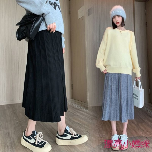 漂亮小媽咪 【S2112】 秋冬 百褶針織裙 針織長裙 秋冬 針織 半身裙 孕婦 可調式腰圍 長裙 韓系 實