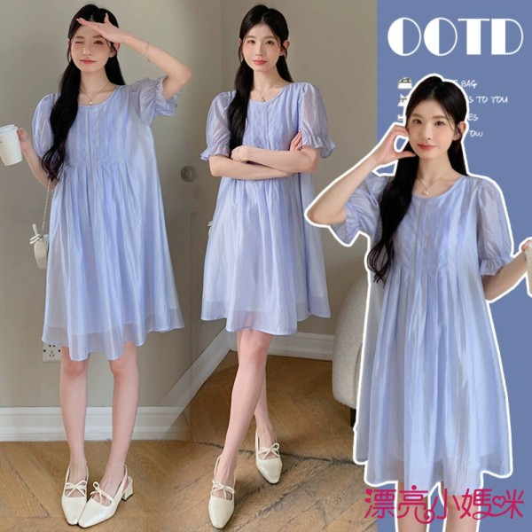 漂亮小媽咪 【D9858】 夏日 法式甜美 天絲 洋裝 公主袖 孕婦洋裝 包袖 韓系 孕婦裝