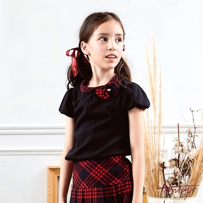 Annys安妮公主-格紋蝴蝶結造型領秋冬款公主袖上衣*9276黑色$631