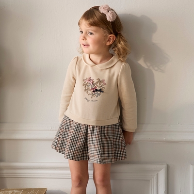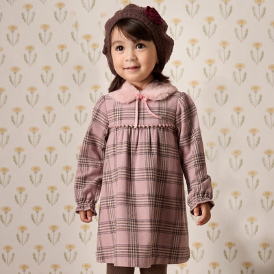 PIPPY 質感小兔狐毛領片格紋洋裝 粉-110-120