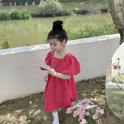 Baby童衣 桃紅泡泡袖格子娃娃裙 女寶寶夏季洋裝 女童短袖洋裝 89035
