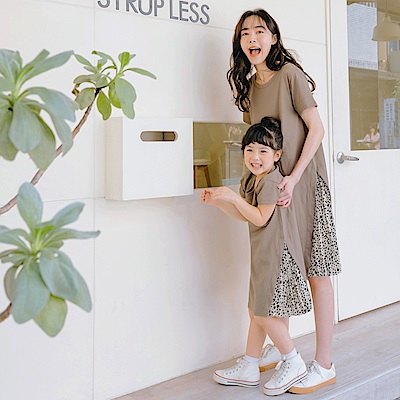 OB嚴選-純棉圓領拼接側開衩百褶豹紋洋裝-親子款(童)