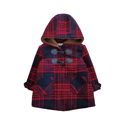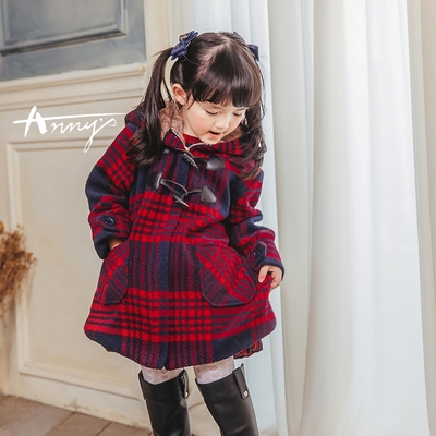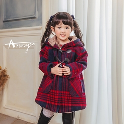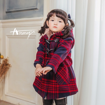 Annys安妮公主-格紋牛角扣混羊毛連帽外套(過年 走春 喜氣)*1672藍色