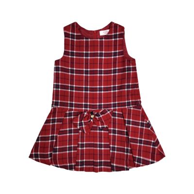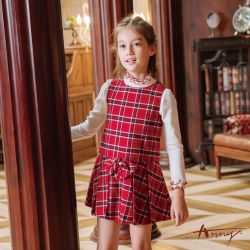 Annys安妮公主-童裝 優雅格紋蕾絲領拼接秋冬款長袖洋裝*2232紅色