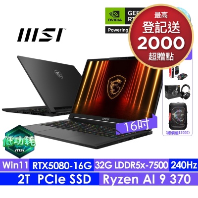 MSI微星 Stealth A16 AI+ A3XWIG-025TW 16吋輕薄電競筆電(Ryzen AI 9 370/32G/2TB SSD/RTX 5080-16G/W11)$94,900