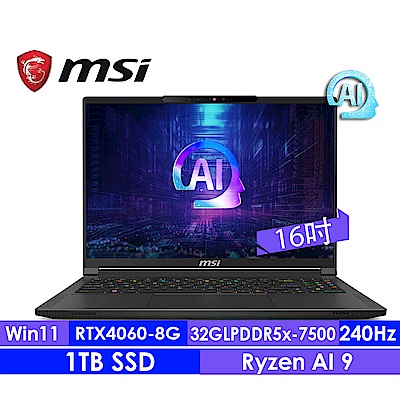MSI微星 Stealth A16 AI+ A3HVFG-058TW 16吋輕薄電競筆電(Ryzen AI 9 365/32G/1T SSD/RTX 4060-8G/W11)