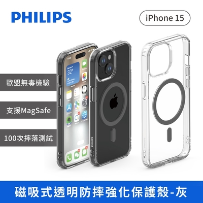 PHILIPS iPhone 15系列 磁吸式透明防摔強化保護殼-灰 DLK6116TG/96~19$40051折