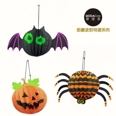 摩達客 萬聖派對佈置 立體紙燈籠吊飾三入組(橘黑蜘蛛+紫黑蝙蝠+橘色南瓜)