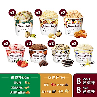 哈根達斯 極致醇厚迷你杯12入組100ml(草莓2/夏果2/草起蛋糕2/抹茶2/焦脆餅2/淇巧2)
