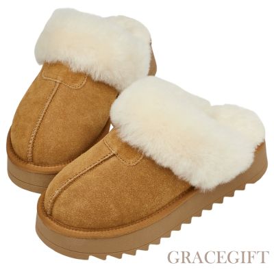 - 【Grace gift】韓妞時尚牛麂皮羊毛厚底雪地拖鞋 栗子$999挑戰低價