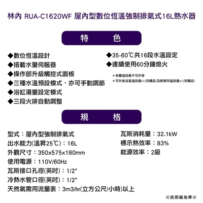 〈全省安裝〉林內熱水器 RUA-C1620WF(NG1/FE式) 屋內型數位恆溫強制排氣式16L_天然