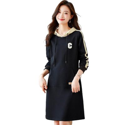 初色 休閒風撞色字母口袋抽繩連帽長袖中長裙連衣裙連身洋裝-黑色-15402(M-2XL可選)