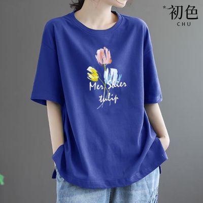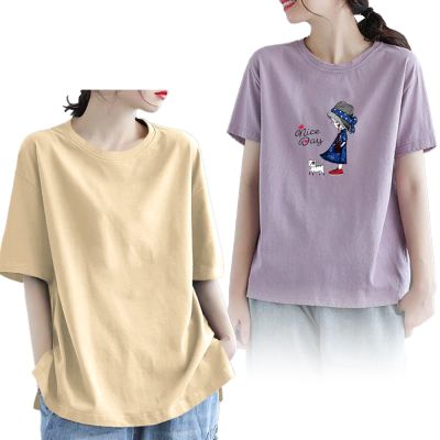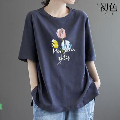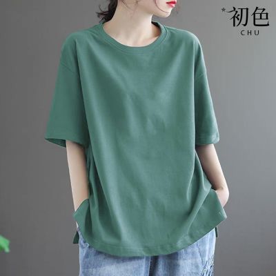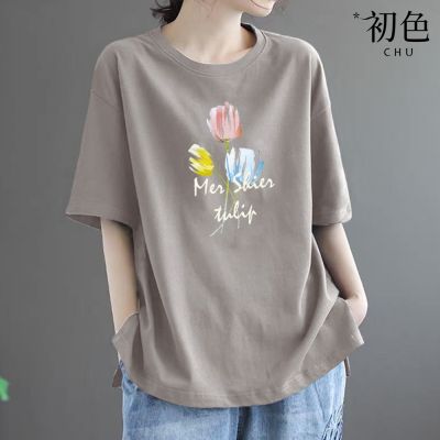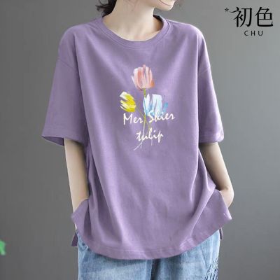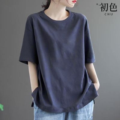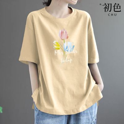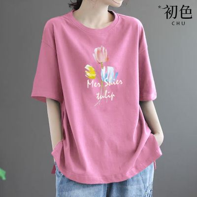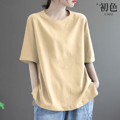 初色 簡約寬鬆素色印花圓領短袖T恤-4款任選-33560(M-2XL可選) product image 1