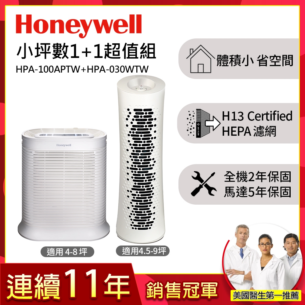 小坪數1+1超值組 美國Honeywell 空氣清淨機( HPA100APTW + HPA030WTW ) product thumbnail 1小坪數1+1超值組 美國Honeywell 空氣清淨機( HPA100APTW + HPA030WTW ) product thumbnail 2