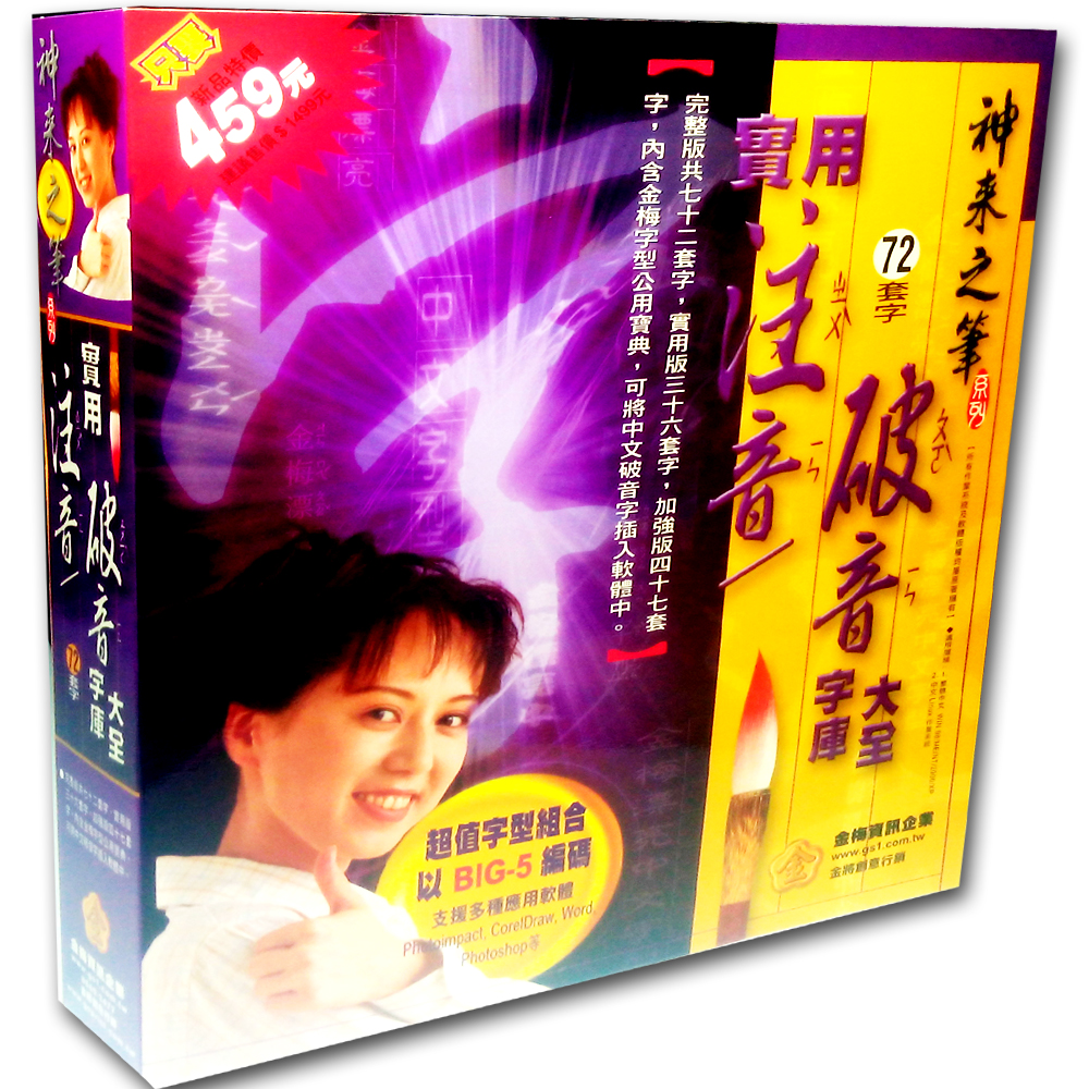 • 完整版共七十二套字,實用版三十六套字,加強版四十七套字,內含金梅字型公用寶典,可將中文破音字插入軟體中。