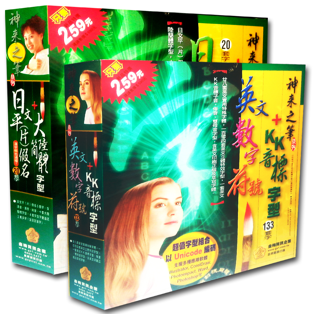 • 日文+大陸簡體字型: 四套字數兩萬多字,六種日文平(片)假名字型.