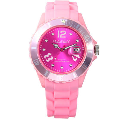 BAKLY 彩艷亮麗人生日期時尚腕錶-桃粉紅/43mm