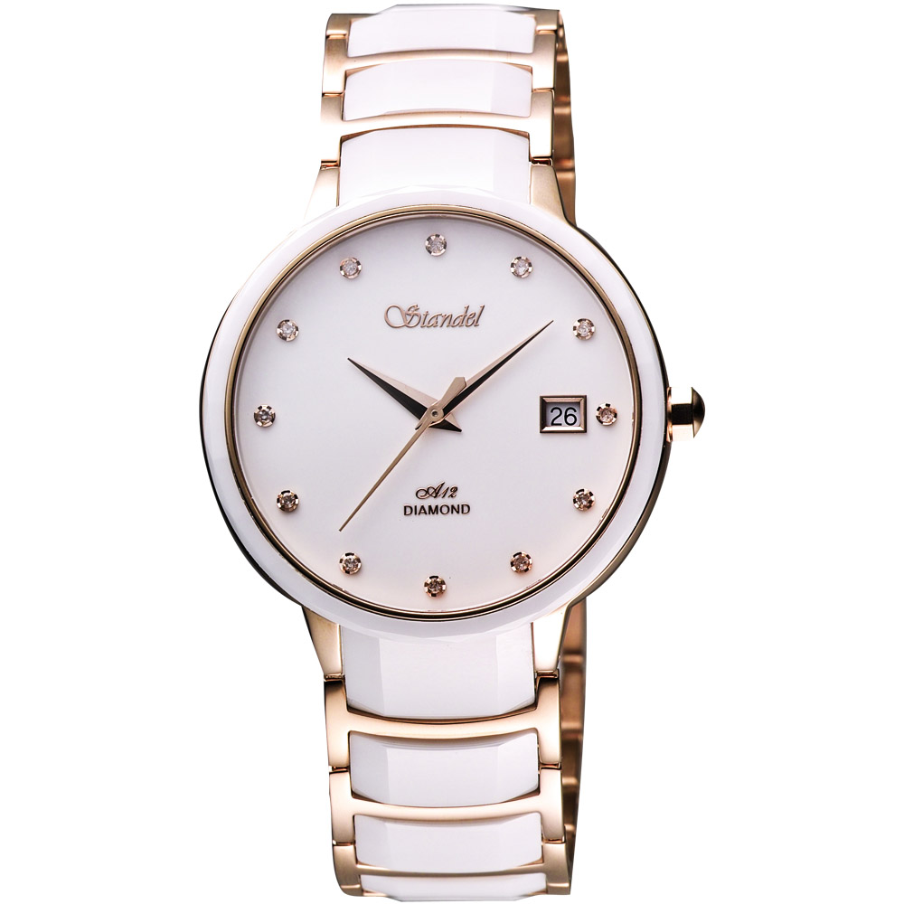 Standel 詩丹麗真鑽時尚陶瓷腕錶-白x玫塊金/38mm