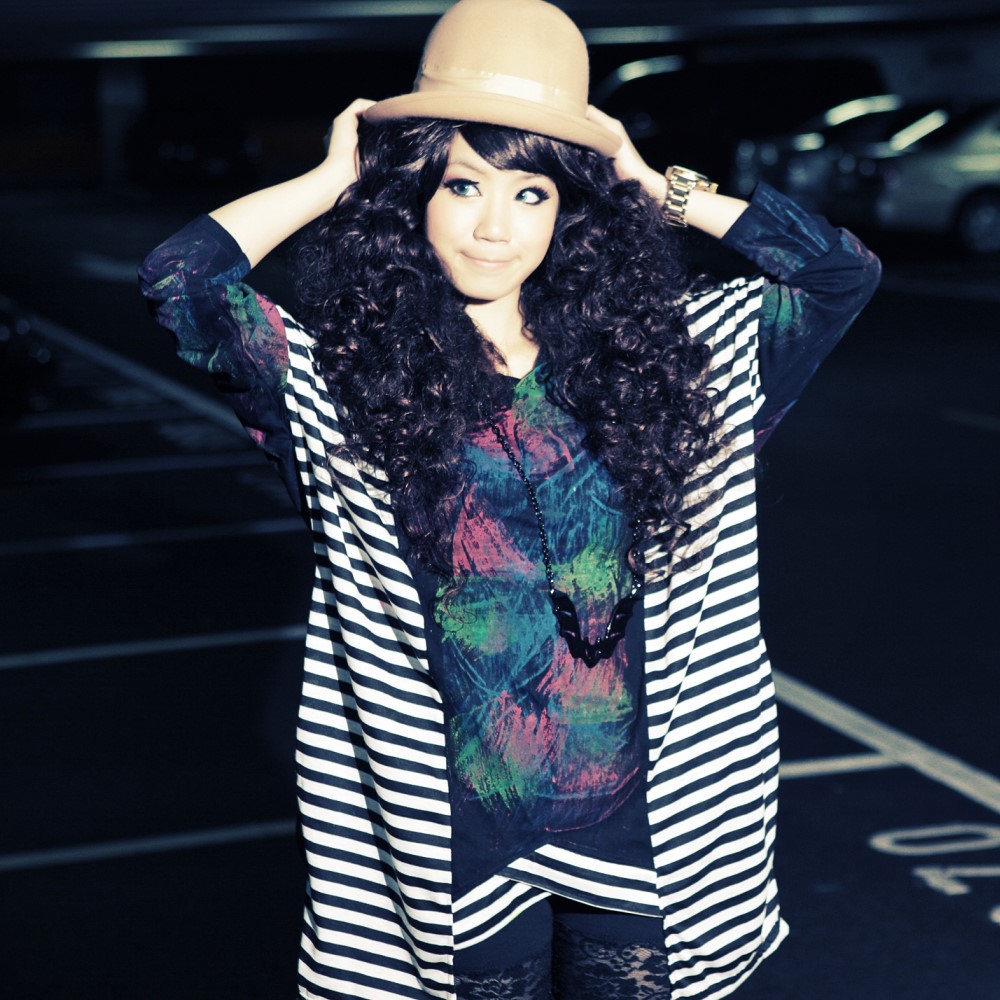 古著 中間背面刷色潑漆兩側拼接黑色條紋連帽長上衣