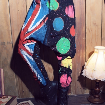 古著 大米字國旗拼接彩色圓點潑墨低檔束口飛鼠褲 product image 1