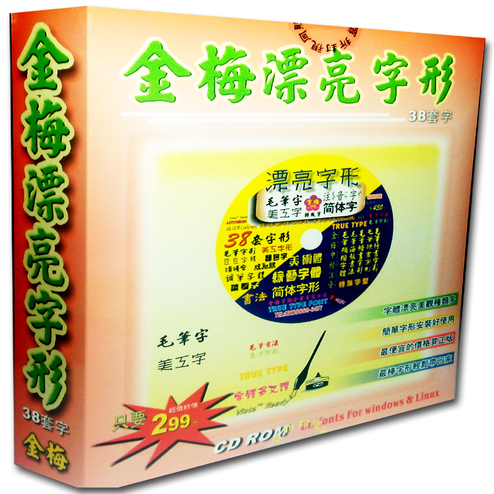 • 本光碟內含38套向量字型,以Big-5及Unicode編碼,內容豐富,字體創新美觀,既獨特又漂亮,內附字型參考範例,字體種類樣式多,實用又便宜.