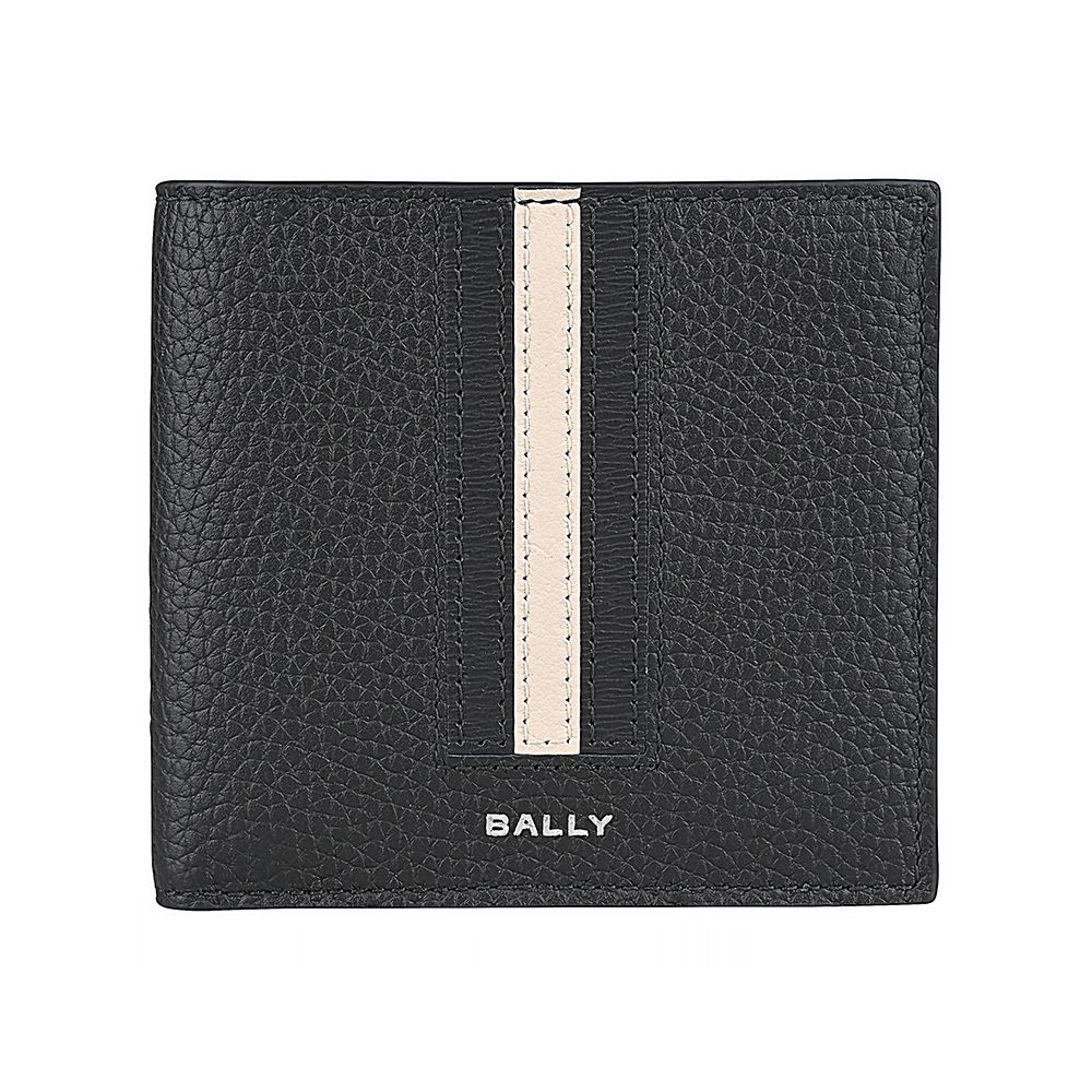 BALLY Ribbon銀漆字母LOGO小牛皮搭黑白直條8卡對開式短夾(男款/黑) product image 1
