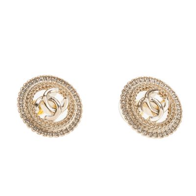 CHANEL 新款金色圓形水鑽雙C LOGO穿式耳環