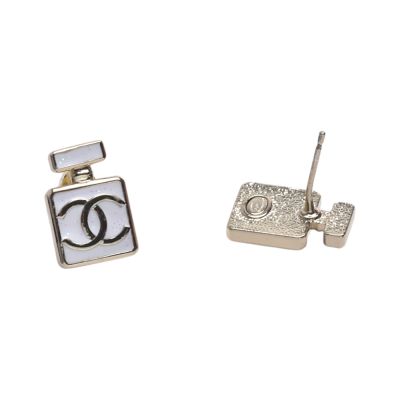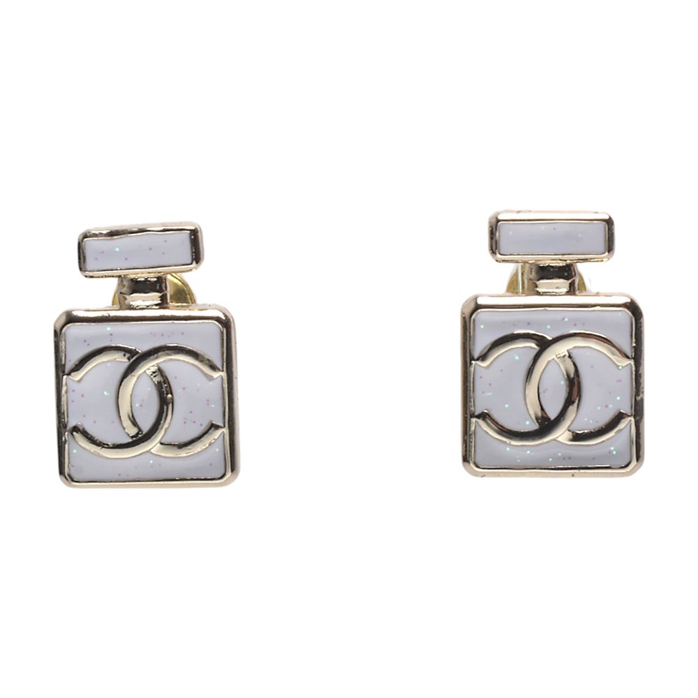 CHANEL 經典雙C LOGO香水造型琺瑯針式耳環(白/金色)