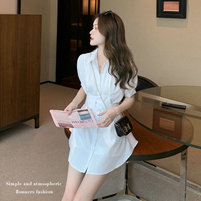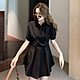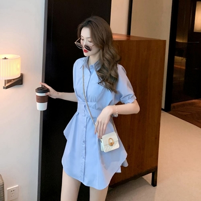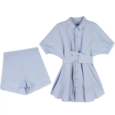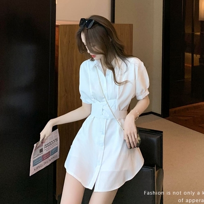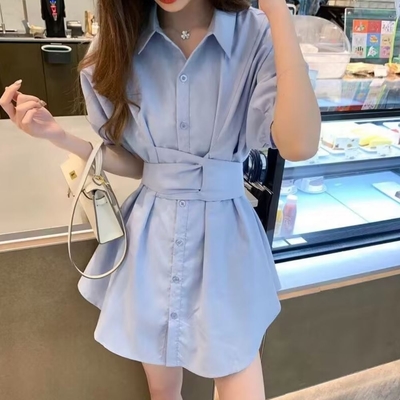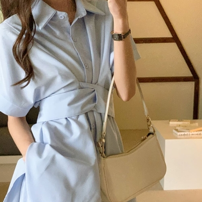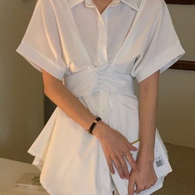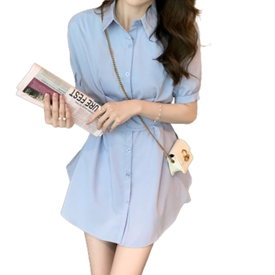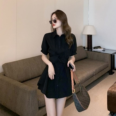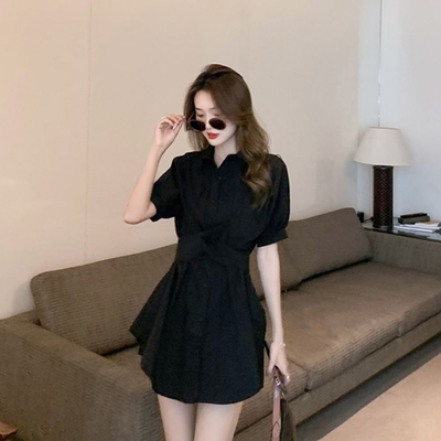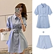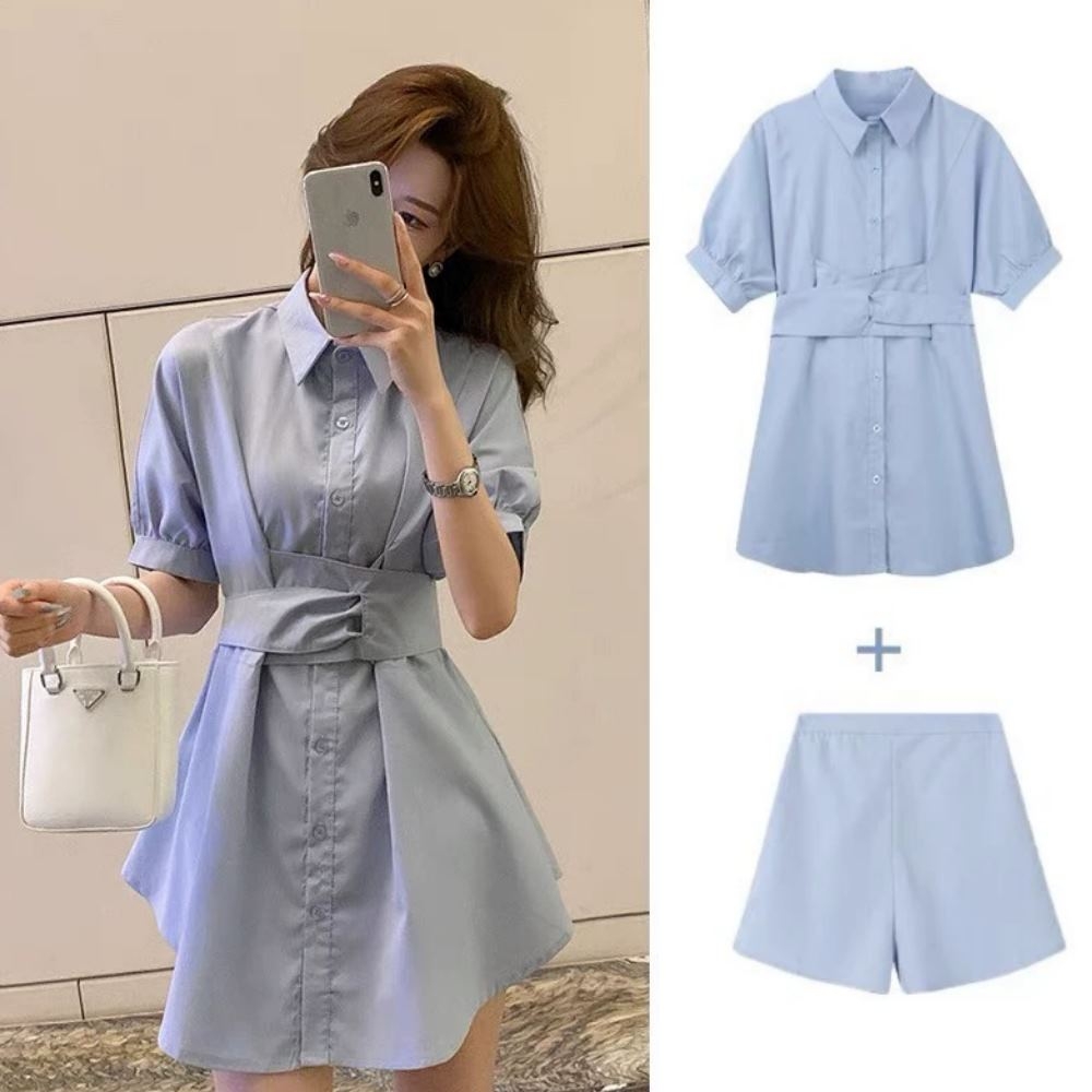 La Belleza素色排釦襯衫束腰綁帶連身裙短洋裝加短褲兩件式套裝