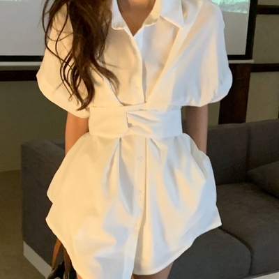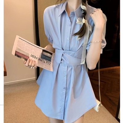 La Belleza素色排釦襯衫束腰綁帶連身裙短洋裝加短褲兩件式套裝 product image 1