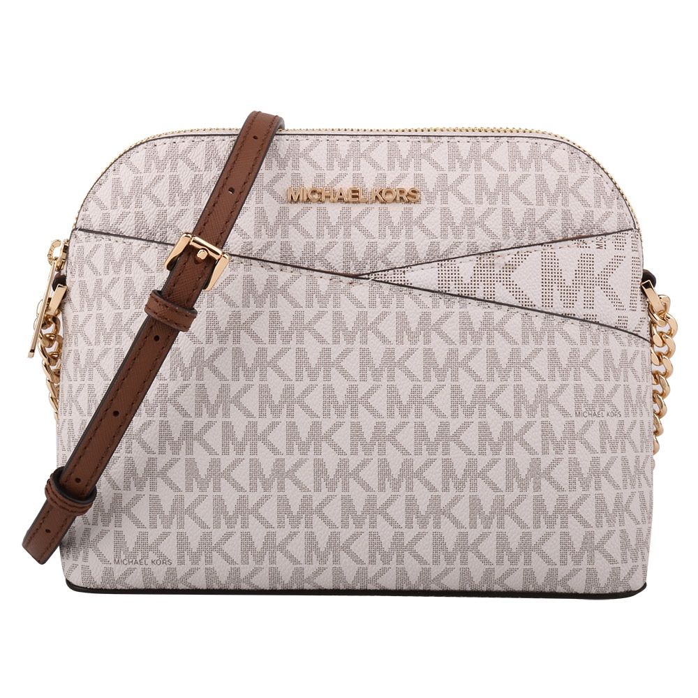 MICHAEL KORS 滿版防刮LOGO 前交叉貝殼型斜背包(白x駝邊)小