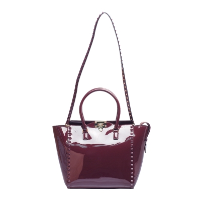 VALENTINO DOUBLE HANDLE BAG鉚釘小牛漆皮金屬釦拉鍊兩用包(藕紫)