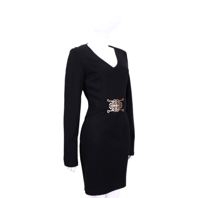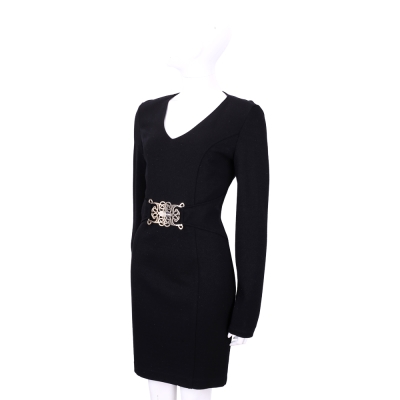VERSACE 黑色V領金屬圖騰腰飾長袖洋裝