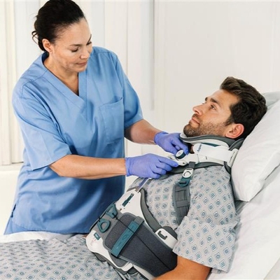 長背架搭配頸圈,可固定頸椎至骶骨