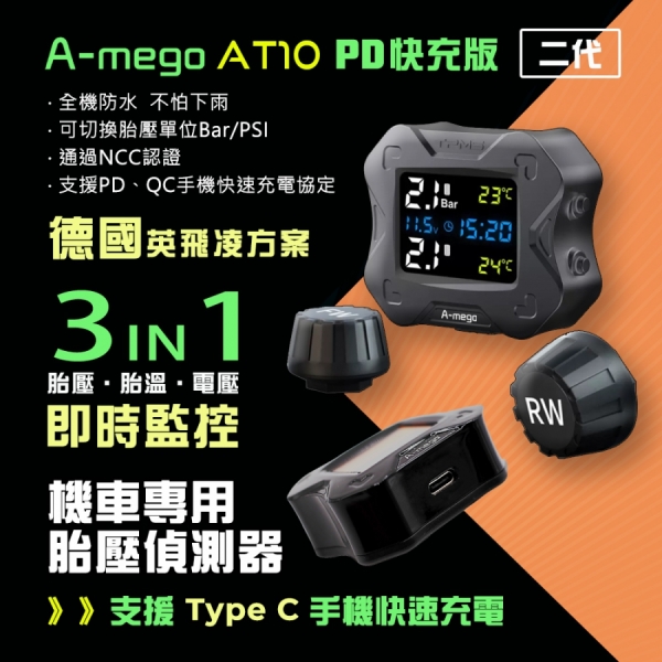 A-mego世暉 AT10二代 機車胎壓偵測器 快充版 3月下殺↘$1980元