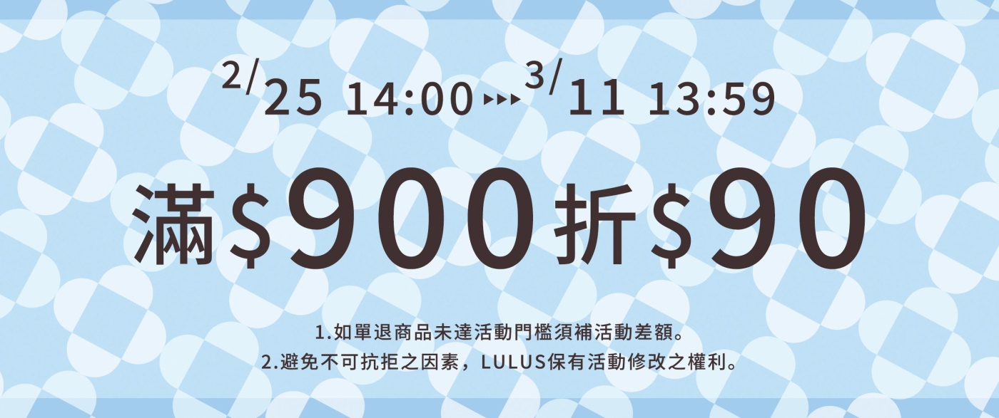 單筆訂單滿$900折90元(不累計) 1.如單退商品未達活動門檻須補活動差額。 2.避免不可抗拒之因素,LULUS保有活動修改之權利。